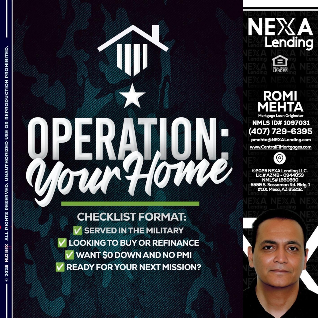 OPERATION YOUR HOME - Romi Mehta -Mortgage Loan OriginatorHi, my name is Romi Mehta. I’m a Loan Officer with NEXA Mortgage LLC., offering personalized mortgage solutions, fast customized quotes, great rates and service with integrity.