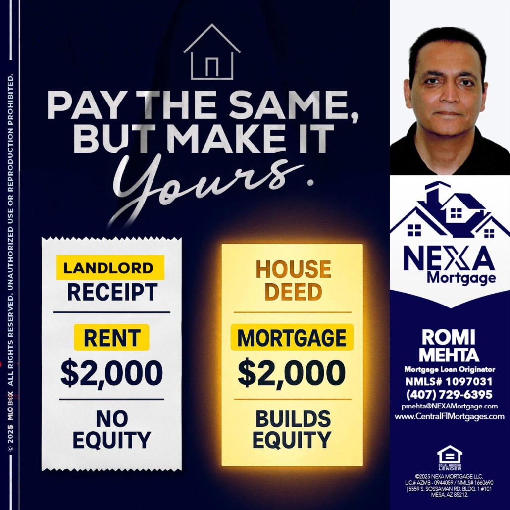 Hi, my name is Romi Mehta. I’m a Loan Officer with NEXA Mortgage LLC., offering personalized mortgage solutions, fast customized quotes, great rates and service with integrity.