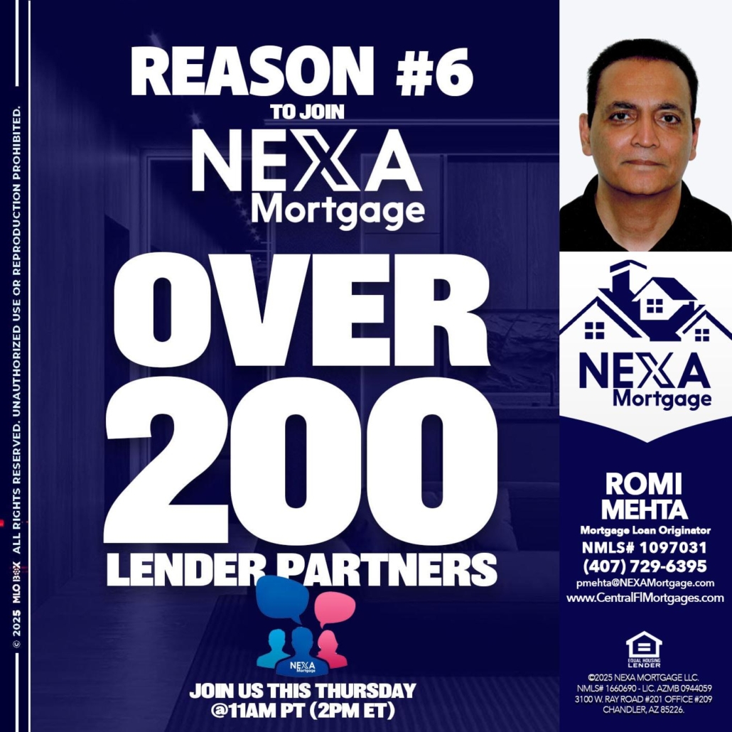 REASON 6 - Romi Mehta -Mortgage Loan OriginatorHi, my name is Romi Mehta. I’m a Loan Officer with NEXA Mortgage LLC., offering personalized mortgage solutions, fast customized quotes, great rates and service with integrity.