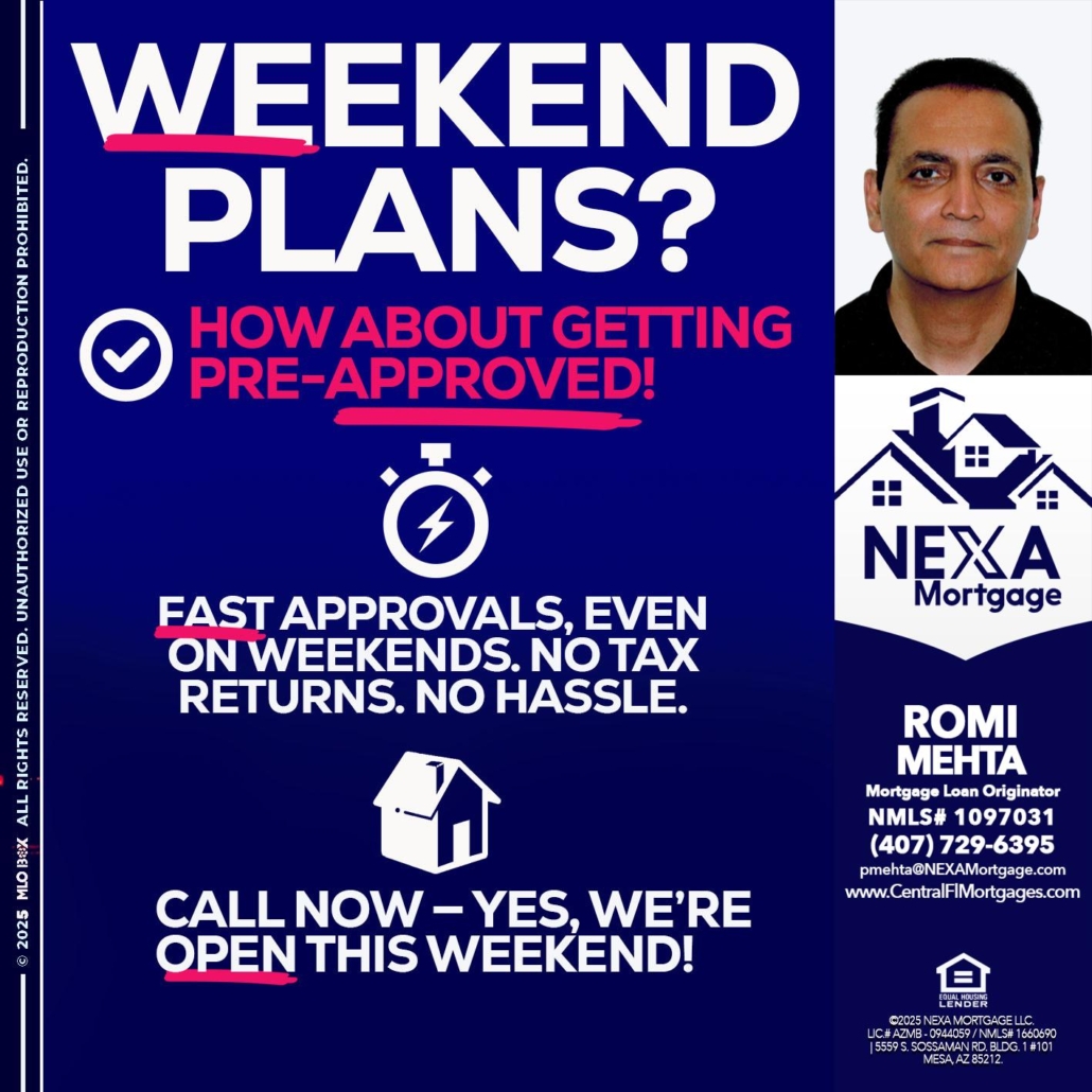 Hi, my name is Romi Mehta. I’m a Loan Officer with NEXA Mortgage LLC., offering personalized mortgage solutions, fast customized quotes, great rates and service with integrity.